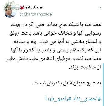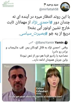 برترین ها نوشت: وی در این مصاحبه صحبتهایی را بیان کرد که موجب واکنش کاربران توئیتری شد. برخی از آنان حتی به خاطر مصاحبه با این رسانه، احمدینژاد را شماتت کردند.