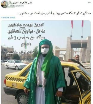 دکتر خلیلی نیا در صفحه شخصی خود در توییتر به دستگیری فردی در ماهشهر که مدعی است که امام زمان(عج) است اشاره کرده است.