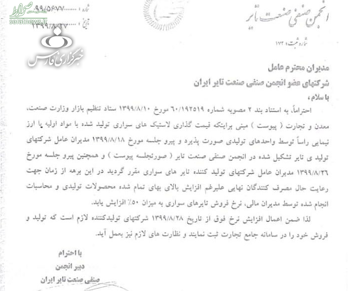 مصطفی تنها سخنگوی انجمن تایر در گفتوگو با فارس با بیان اینکه در پی افزایش قیمت مواد اولیه تولید تایر، قیمت تایرهای سواری با هماهنگی سازمان حمایت مصرفکنندگان 50 درصد افزایش یافت، اظهار داشت: این مصوبه از 28 آبان قابل اجرا است و فقط شامل تایرهای سواری میشود.