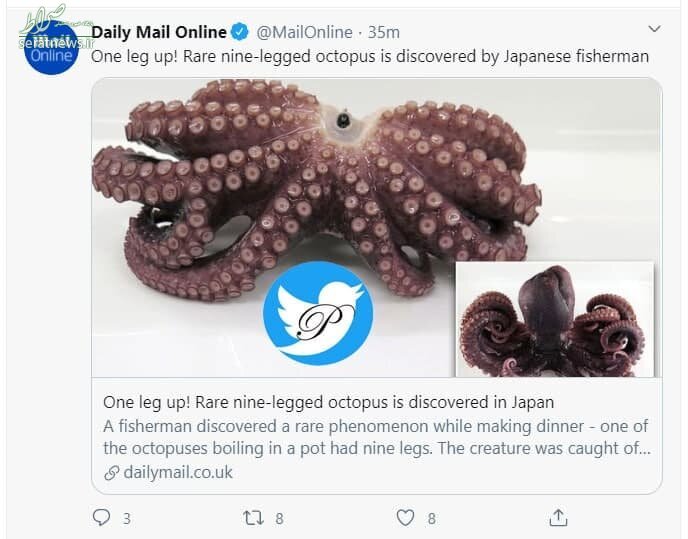 یک پا بیشتر! این عنوانی است که رسانههای جهان برای اختاپوس عجیبی که توسط ماهیگیران ژاپنی صد شده به کار بردهاند. این اختاپوس به جای هشت پا، ۹ پا دارد و تعجب جانورشناسان را برانگیخته است.