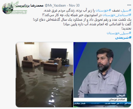 هفته دوم آذر ماه بود که بارش شدید باران آبگرفتگی شدید و جاری شدن سیل در مناطقی از استان خوزستان را رقم زد. متاسفانه سطح آب آنقدر زیاد بود که به داخل منازل مردم نفوذ و زندگی و اموال آنان را تخریب کرد. در برخی مناطق به دلیل جمع شدن آب در کوچهها و خیابانها مردم برای تردد با مشکل مواجه شدند تاجایی که برخی تا زانو در آب بودند.
