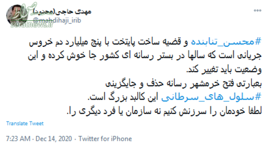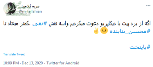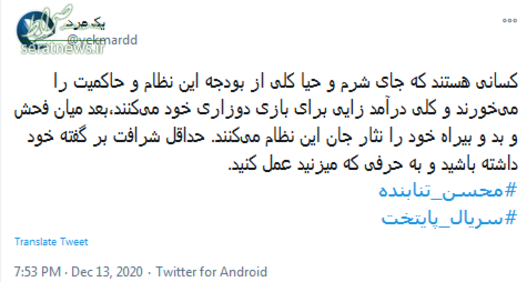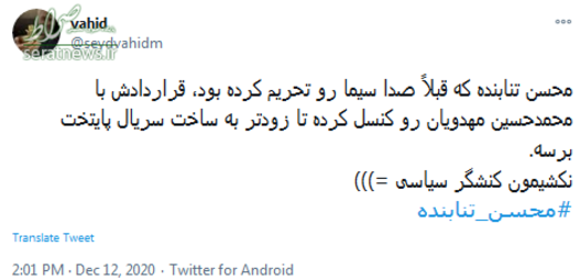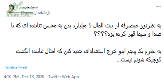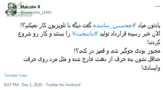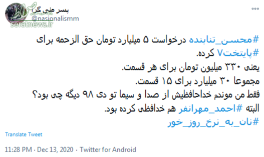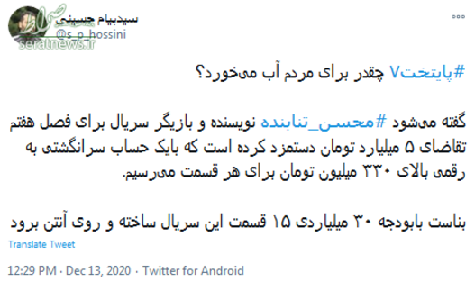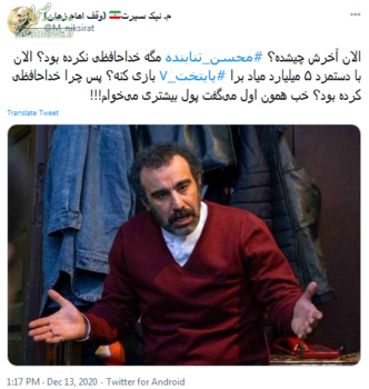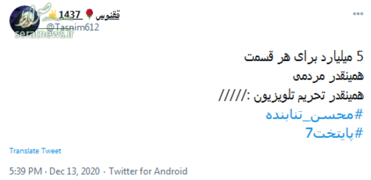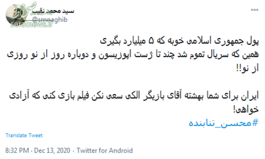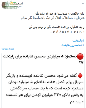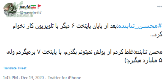 از طرفی پیشنهاد دستمزد ۵ میلیاردی برای بازی در یک مجموعه تلویزیونی آن هم در این شرایط اقتصادی که اکثر مردم با مشکل مواجهند و از طرف دیگر خداحافظی او از تلویزیون در مواقع حساس و بحرانی، هشتگ #محسن_تنابنده را در توئیتر داغ کرد و کاربران نظراتشان را در این باره به اشتراک گذاشتند.