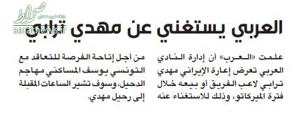 روزنامه «العرب» خبر داد باشگاه العربی در نقل و انتقالات زمستانی مهدی ترابی را یا به صورت قرضی در اختیار تیم دیگری قرار میدهد و یا او را به فروش میرساند.