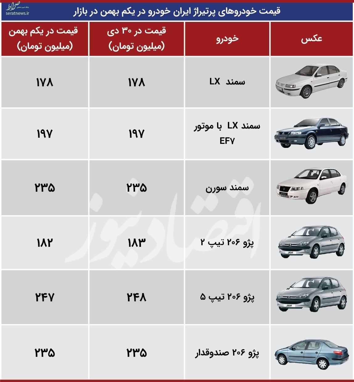 رصد بازار خودرو نشان دهنده آن است که امروز بازار محصولات ایران خودرو همانند روزهای گذشته شاهد افت قیمت دو خودرو پژو 206 تیپ 2 و تیپ 5 بوده؛ بطوریکه این دو خودرو نسبت به روز گذشته افت یک میلیونی قیمت را تجربه کردند.