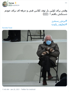 روز گذشته در مراسم تحلیف جو بایدن چهل و ششمین رئیس جمهور آمریکا به همراه کامالا هریس معاونش در کنگره آمریکا، با حواشی جذابی همراه بود که دستمایه شوخی کاربران فضای مجازی شد. حضور آرام برنی سندرز با لباسی غیررسمی، نحوه نشستن و ژست خاص او در این مراسم از نگاه عکاسان مخفی نماند و به سرعت در شبکه‌های اجتماعی خبرساز شد.