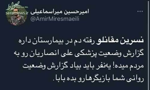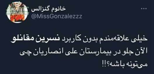 نسرین مقانلو در بیمارستان فرهیختگان: خوشبختانه اکسیژن خون علی انصاریان بالا اومده و حالش دارد بهتر میشود.
