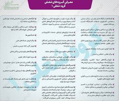 به گفته دبیرکل اتاق اصناف ایران، گروه اول شامل مشاغل تولیدی و توزیعی در زمینههای اقلام غذایی مانند سوپرمارکتها، نانواییها، قطعات یدکی خودرو، تعمیرگاههای خودرو، داروخانهها، مراکز بهداشتی و درمانی و … هستند که میتوانند در شرایط قرمز بودن شهرها، به فعالیت ادامه دهند.