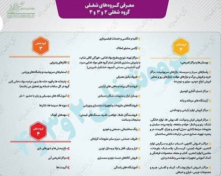 به گزارش مهر وی با اشاره به اصلاح گروهبندی مشاغل و اصناف گفت: در اصلاحیه جدید، همه فعالیتهای کشور اعم از تولیدی، توزیعی و صنفی در گروههای جدید قرار داده شدهاند که به چهار گروه تقسیم میشوند. بر اساس این اصلاحیه در شرایط قرمز، صرفاً گروههای شغلی اول مجاز به فعالیت هستند، در شرایط نارنجی، گروههای اول و دوم مجاز به فعالیت بوده و در شرایط زرد، سه گروه اول میتوانند فعالیت داشته باشند.