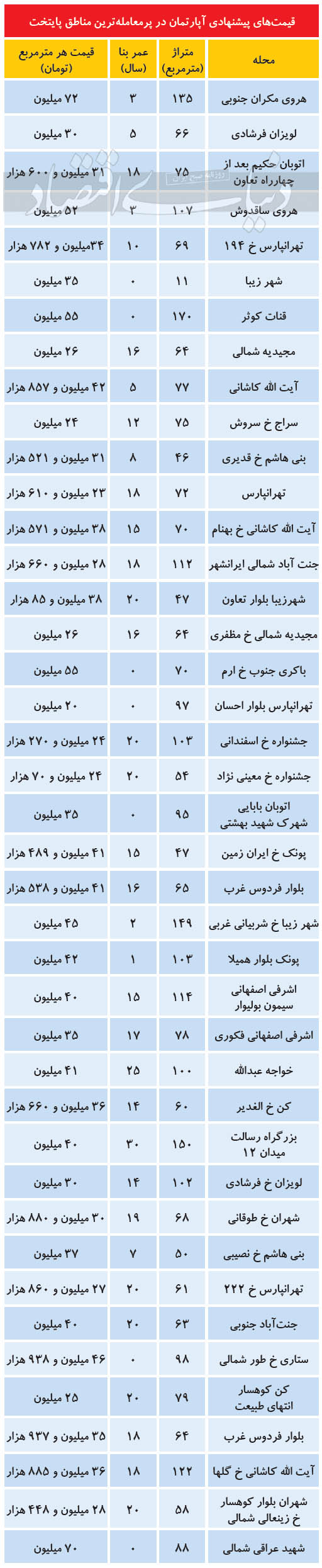 جدول/ قیمت آپارتمان در تهران؛ ۲۸ فروردین ۱۴۰۰