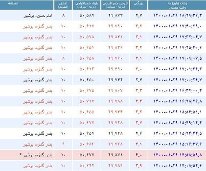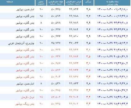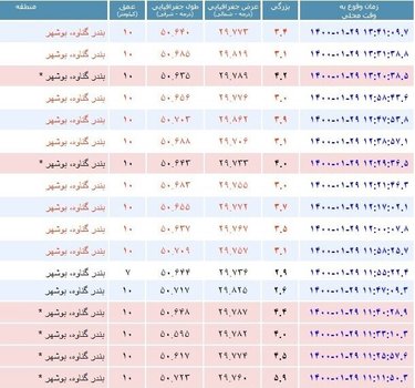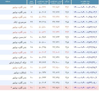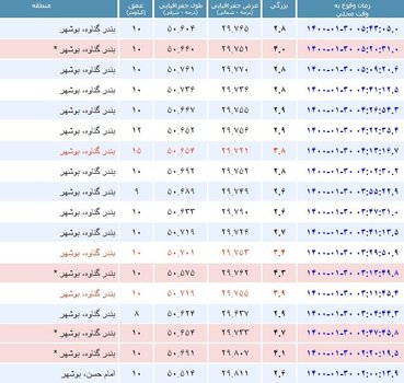 جداول زیر همه زمینلرزههای شهرستان گناوه از صبح یکشنبه تاکنون آمده است.