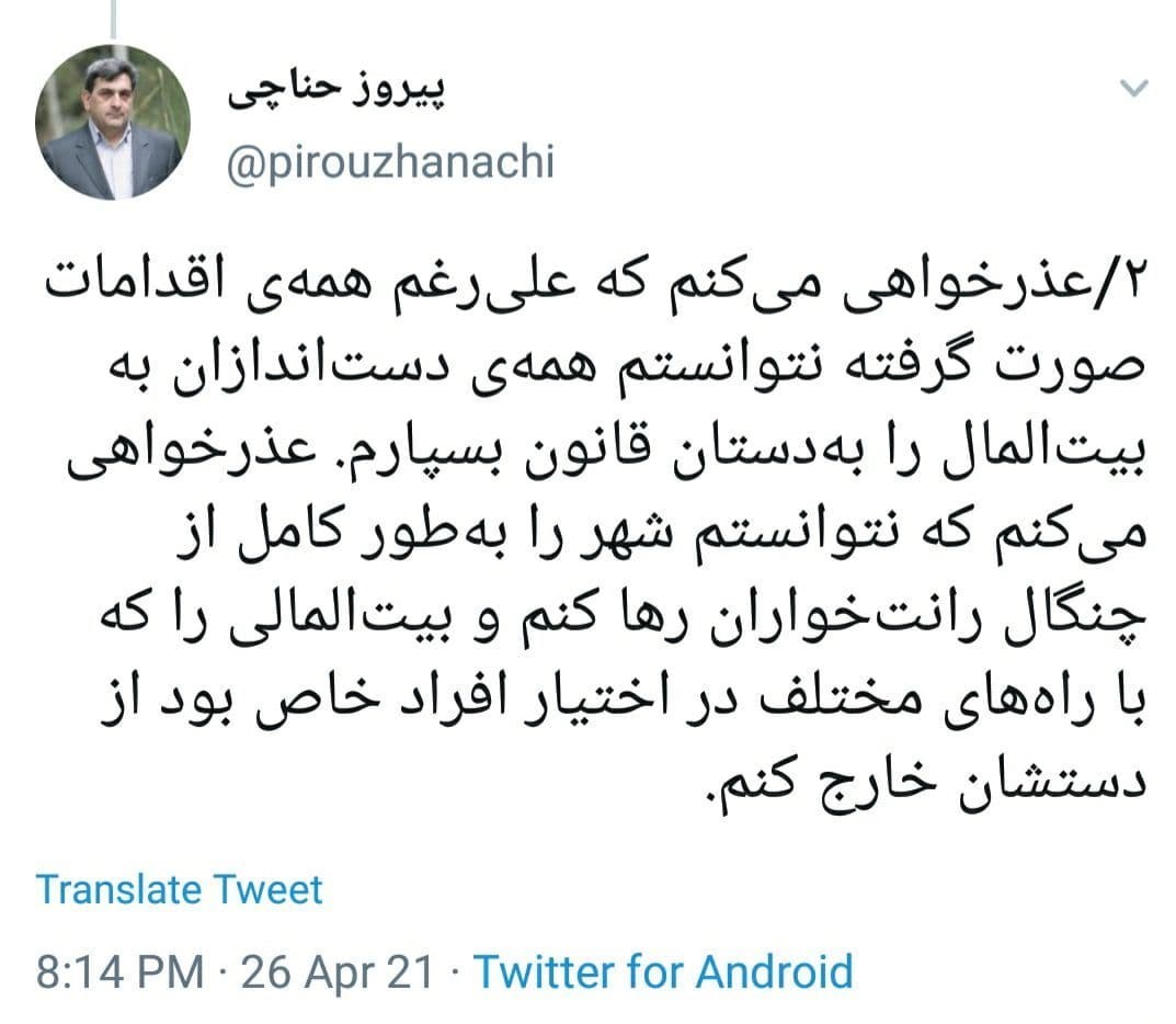 دو: عذرخواهی میکنم که علیرغم همه اقدامات صورت گرفته نتوانستم همه دستاندازان به بیت المال را به دستان قانون بسپارم. عذرخواهی میکنم که نتوانستم شهر را به طور کامل از چنگال رانت خواران رها کنم و بیت المالی را که از راههای مختلف در اختیار افراد خاص بود از دستانشان خارج کنم.