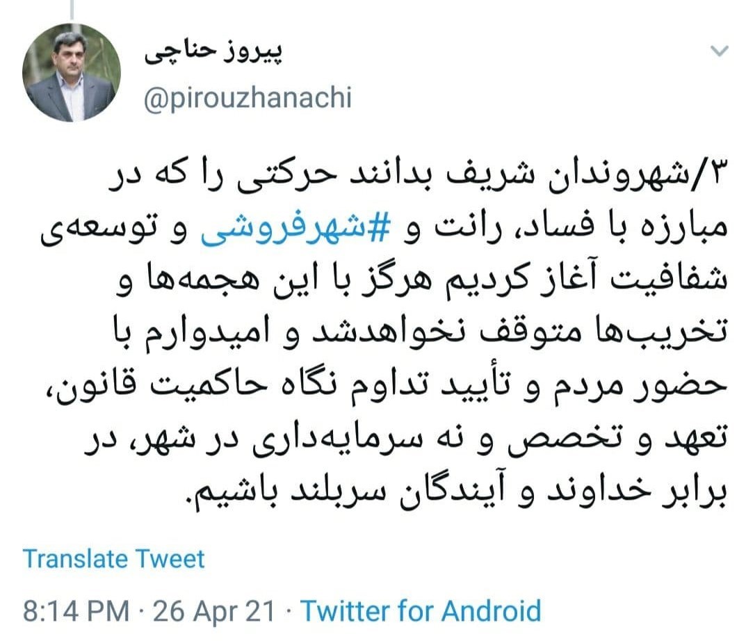 سه: شهروندان شریف بدانند حرکتی که در مبارزه با فساد، رانت و شهرفروشی و توسعه شفافیت آغاز کردهایم هرگز با این هجمهها و تخریبها متوقف نخواهد شد و امیدوارم با حضور مردم و تایید تداوم نگاه حاکمیت قانون، تعهد و تخصص و نه سرمایهداری در شهر، در برابر خداوند و آیندگان سربلند باشیم.