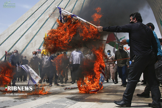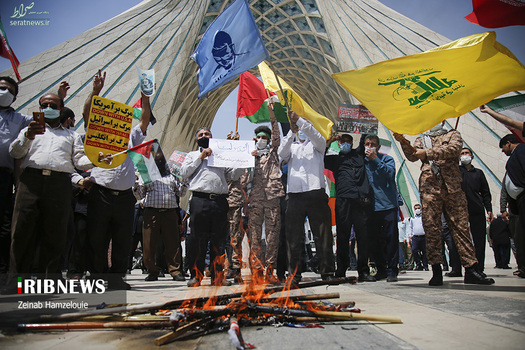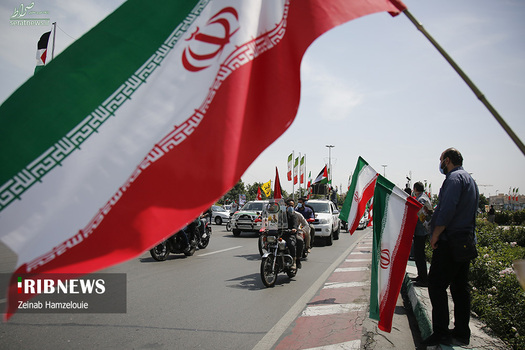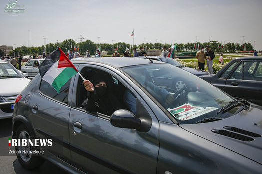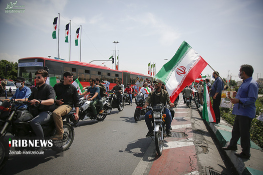راهپیمایی خودجوش خودرویی و موتوری مردمی روز قدس همراه با آتش کشیدن پرچم آمریکا و اسرائیل امروز جمعه ۱۷ اردیبهشت در میدان آزادی برگزار شد.