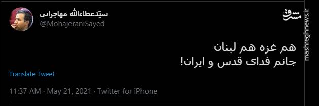 عطاءالله مهاجرانی وزیر ارشاد دولت خاتمی که در انگلیس سلکن است، در توئیتی به شعار فتنه گران ۸۸ که میگفتند "نه غزه نه لبنان، جانم فدای ایران" واکنش نشان داد و نوشت: هم غزه هم لبنان؛ جانم فدای قدس و ایران!