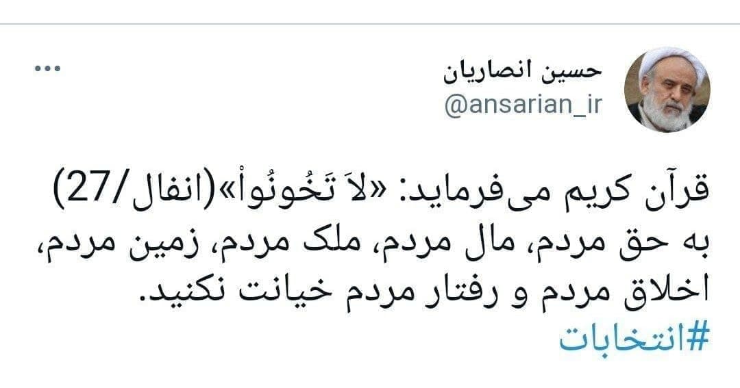شیخ حسین انصاریان در توئیتی به کاندیداهای انتخابات توصیه ای کرده است.