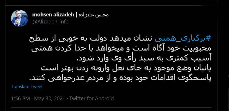یک کاربر در توئیتی نوشت: برکناری همتی نشان میدهد دولت به خوبی از سطح محبوبیت خود آگاه است و میخواهد با جدا کردن همتی آسیب کمتری به سبد رأی وی وارد شود. بانیان وضع موجود به جای نعل وارونه زدن بهتر است پاسخگوی اقدامات خود بوده و از مردم عذرخواهی کنند.