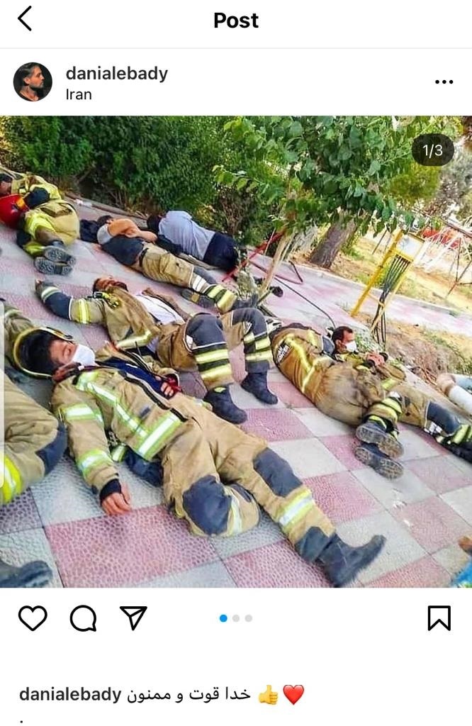 دانیال عبادی بازیگر سینما و تئاتر با انتشار پستی به آتش نشانانی که برای  حادثه دیروز پالایشگاه نفت تهران زحمت کشیدند خدا قوت گفت.