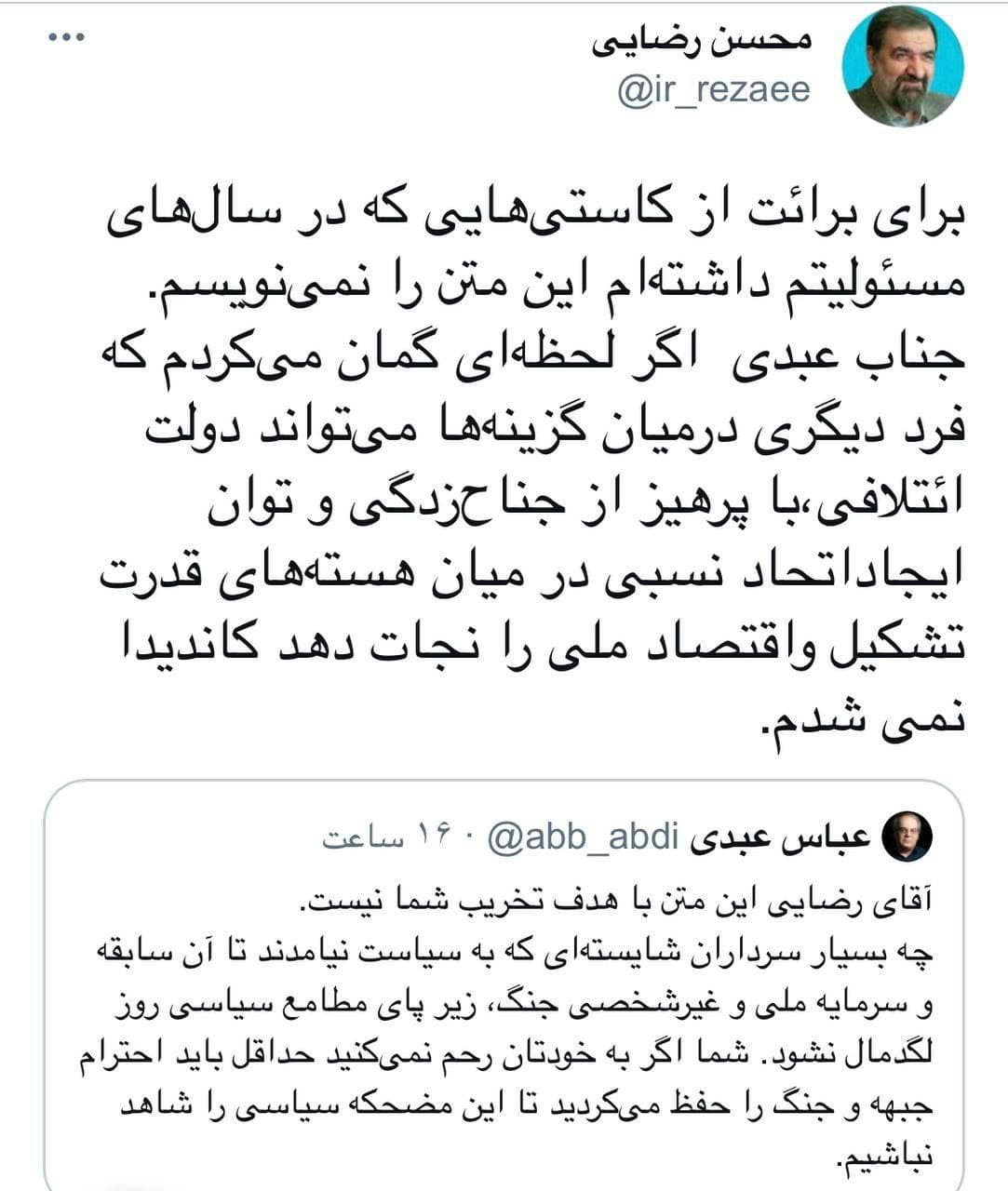 تصویر/ پاسخ محسن رضایی به عباس عبدی