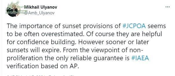 میخائیل اولیانوف در توئیتی نوشت: گویی درباره اهمیت بندهای غروب افتاب در برجام مبالغه میشود. البته آن ها برای اعتماد سازی مفید هستند، اما دیرو یا زود به پایان میرسند و تنها ضمانت قابل اعتماد (درباره برنامه صلح آمیز هسته ای ایران)، راستی آزمایی آژانس بینالمللی انرژی اتمی حسب پروتکل الحاقی است.
