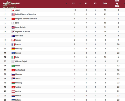 روسیه، بریتانیا و کره جنوبی هم به ترتیب با 18،13 و 10 مدال در رده های چهارم تا ششم قرار دارند.