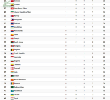کاروان ایران هم با همان مدالی که توسط جواد فروغی بدست آورد در رده بیست و سوم مشترک قرار دارد.