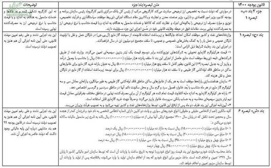 الف- جلوگیری از بهبود معیشت مردم: جزء ۳ بند «ب» تبصره ۱ (نظارت بر توزیع ارز ترجیحی کالاهای اساسی)، بند «ح» تبصره ۱ (توسعه زیرساخت های حمل و نقل با اصلاح قیمت گازمایع و توزیع یارانه نقدی آن)، بند «ب» تبصره ۱۴ (ثبت نام جاماندگان و منصرف شدگان از دریافت یارانه)، جزء ۱۰ بند «الف» تبصره ۱۸ (اعطای وام ساخت مسکن به ۱.۲ میلیون خانوار)