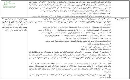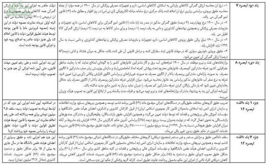 ب- کاهش درآمدها: بند «ش» تبصره ۶ (مالیات بر خودروهای لوکس)، بند «خ» تبصره ۶ (مالیات بر املاک لوکس)، بند «و» تبصره ۷ (اصلاح نرخ ارز مبنای محاسبه حقوق ورودی کالاها)، بند «ی» تبصره ۸ (تعیین تعرفه های آب و برق و گاز بخش خانگی براساس الگوی افزایش پلکانی (آی.بی.تی)