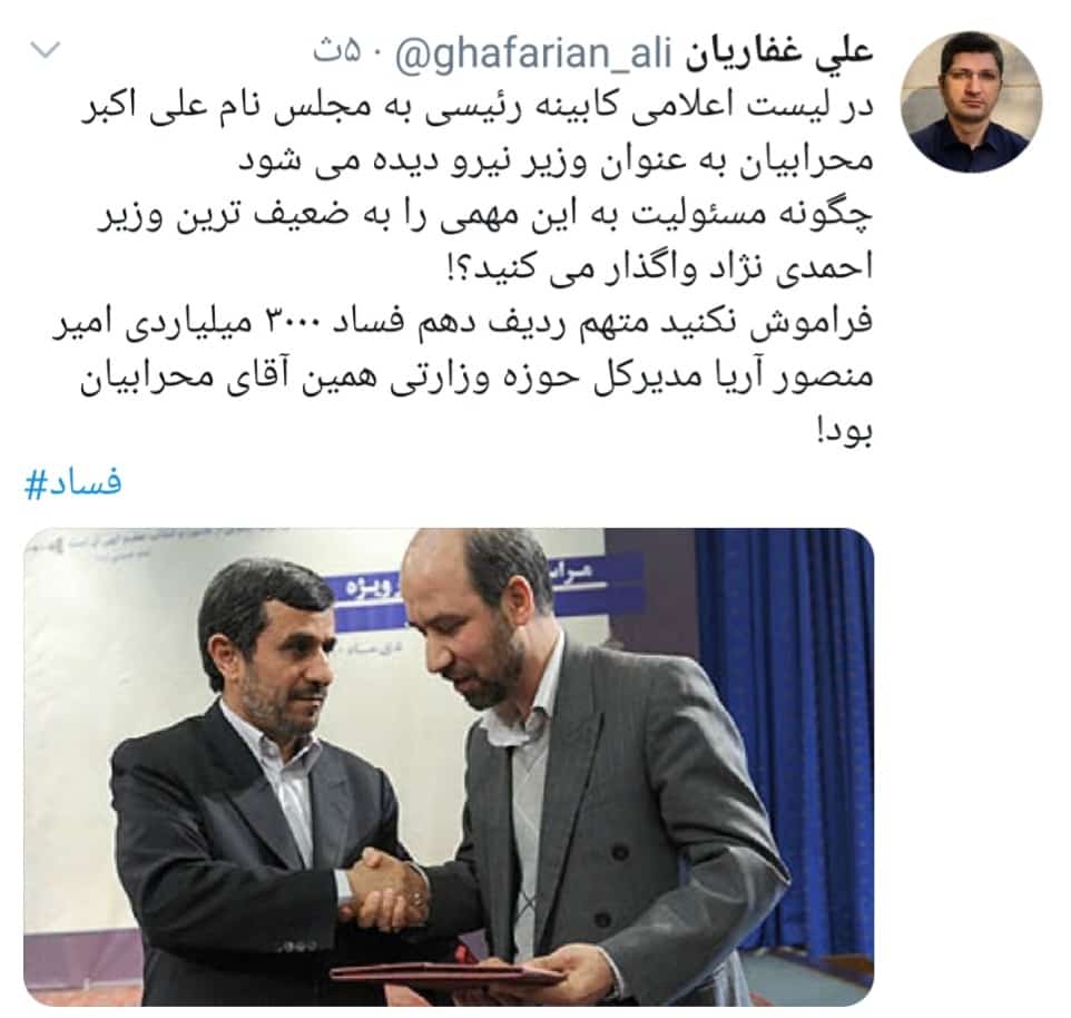 عکس/ توئیت مدیرمسئول صراط پیرامون معرفی محرابیان بعنوان وزیر نیرو