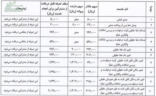 در ماده یک این مصوبه ذکر شده که سقف تعرفه خدمات تلفن ثابت قابل ارایه در دفاتر پیشخوان خدمات دولت و بخش عمومی غیردولتی ارتباطات و فناوری اطلاعات (ICT) روستایی و دفاتر فروش و خدمات حضوری دارندگان پروانه ارایه خدمات تلفن ثابت که در این مصوبه به اختصار دفاتر نامیده میشوند، به شرح زیر تعیین شده است.