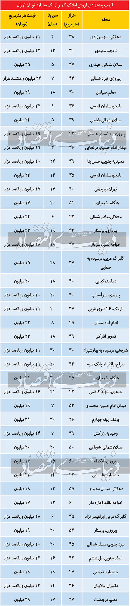 جدول/ املاک کمتر از یک میلیارد تومان در پایتخت