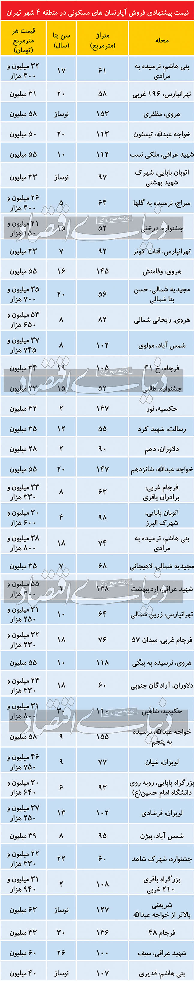 جدول/ مظنه آپارتمانهای مسکونی در منطقه ۴ تهران