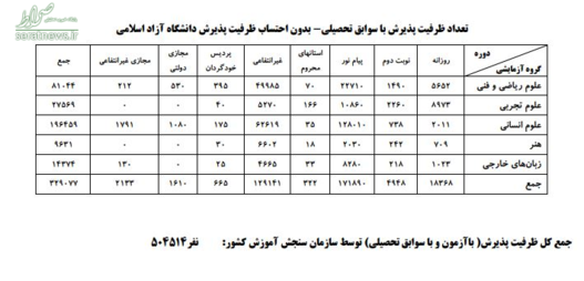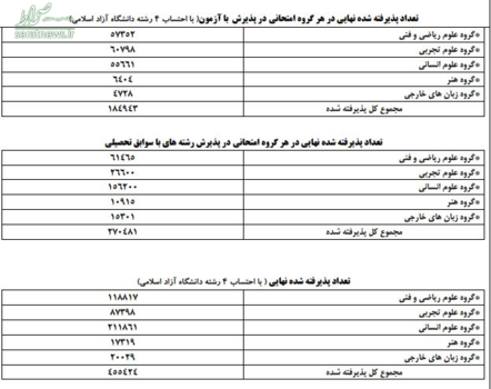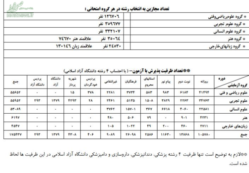 در سر جلسه آزمون هم یک میلیون و 184 هزار و 130 نفر شرکت کردند؛ تعداد داوطلب انتخاب رشته کننده در رشتههای با آزمون 523 هزار و 888 نفر و تعداد ثبت نام و انتخاب رشته کننده در پذیرش صرفا با سوابق تحصیلی 111 هزار و 944 نفر بود.