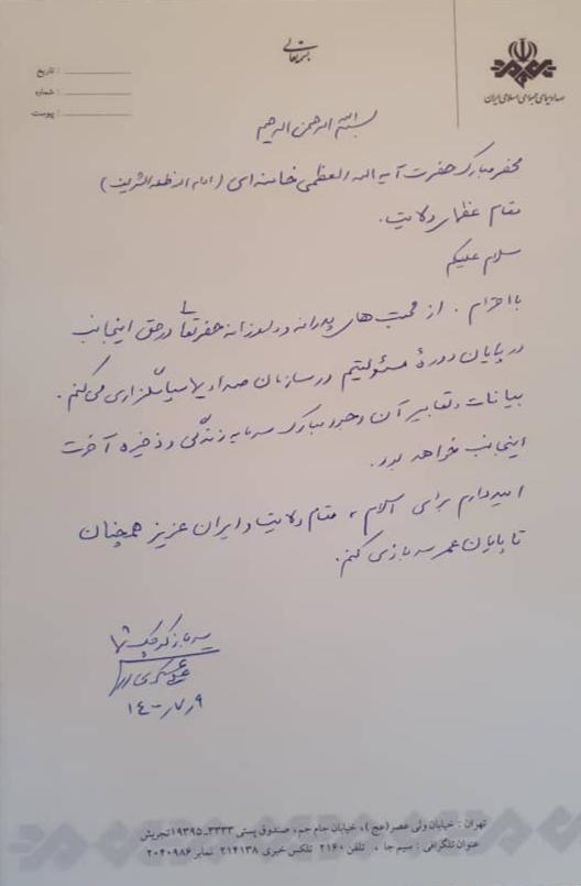 با احترام از محبت های پدرانه و دلسوزانه حضرتعالی در حق این جانب در پایان دوره مسئولیتم هم در سازمان صدا و سیما سپاسگزاری می کنم.