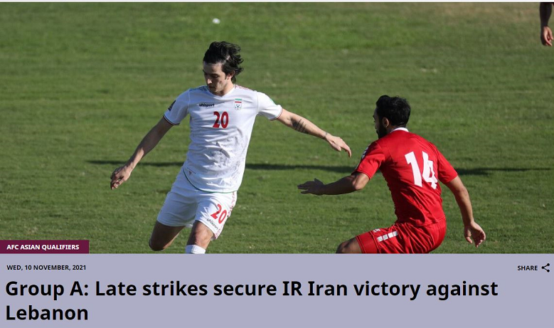 تیم ملی فوتبال کشورمان امشب در دور پنجم مسابقات انتخابی جام جهانی ۲۰۲۲ میهمان لبنان بود که با نتیجه ۲ بر یک به پیروزی رسید. سایت AFC در واکنش به این برد ارزشمند تیم ملی نوشت: تیم ملی ایران با حملات دیرهنگام در وقتهای اضافه موفق شده بازی باخت را با برد مقابل لبنان به پایان ببرد. شاگردان اسکوچیچ با این برد ۱۳ امتیازی شدند و صدر جدول را از کره ۱۱ امتیازی بعد از گذشت چند ساعت پس گرفتند.