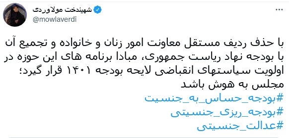 پیش از این نیز فاطمه قاسمپور، رییس فراکسیون زنان و خانواده مجلس شورای اسلامی در حساب توییتری خود با اشاره به ارائه لایحه بودجه ۱۴۰۱ توسط رئیس جمهوری به مجلس شورای اسلامی روز یکشنبه ۲۱ آذر، نوشته بود: دیروز لایحه بودجه ۱۴۰۱ به مجلس داده شد. نکته قابل تامل، قرار گرفتن بودجه معاونت امور زنان ذیل بودجه نهادریاست جمهوری و عدم تخصیص بودجه مجزا به این معاونت است. اقدامات ستاد کوچک معاونت زنان در این شرایط، کم اثر خواهدشد. در مجلس اختصاص بودجه های متمرکز درحوزه زنان را پیگیر خواهم بود.