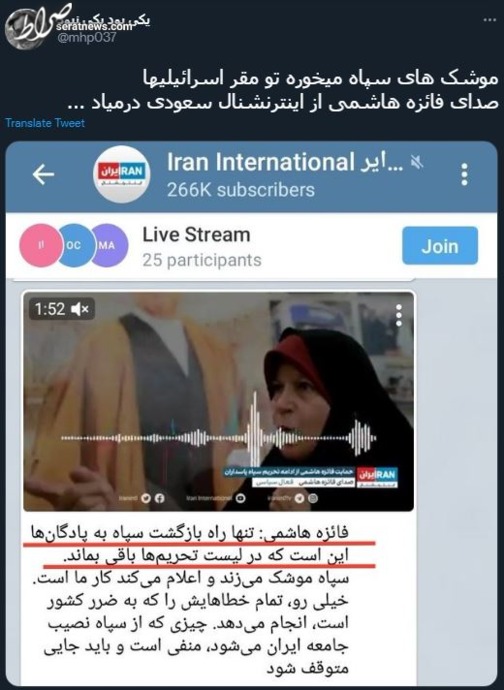 به گزارش پایگاه خبری صراط به نقل از فارس، فائزه هاشمی عضو شورای مرکزی حزب کارگزاران سازندگی شامگاه شنبه ۲۷ فروردین در یک جلسه اینترنتی در کلاب هاوس گفت: «تنها راه بازگشت سپاه به پادگانها این است که در لیست تحریمها باقی بماند! چیزی که از سپاه نصیب جامعه ایران میشود، منفی است و باید جایی متوقف شود».