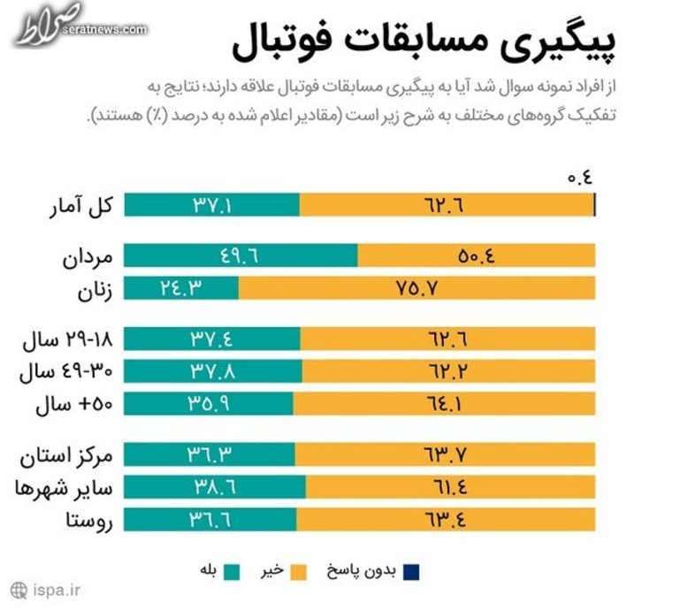 به گزارش پایگاه خبری صراط به نقل از ایسنا، با توجه به نزدیک بودن زمان شروع مسابقات فوتبال جام جهانی ۲۰۲۲ قطر، مرکز افکارسنجی دانشجویان ایران (ایسپا) وابسته به جهاد دانشگاهی، نظرسنجی را با جامعه آماری افراد بالای ۱۸ سال کل کشور (شهر و روستا) و تعداد نمونه ۱۵۷۰ نفر به شیوه مصاحبه تلفنی در فروردینماه ۱۴۰۱ درخصوص نگرش شهروندان پیرامون ورزش فوتبال و مسابقات جام جهانی انجام داد. ۵۰.۷ درصد پاسخگویان این نظرسنجی مرد و ۴۹.۳ درصد زن بودند. ۲۷.۷ درصد پاسخگویان در رده سنی ۱۸ تا ۲۹ سال، ۴۷.۱ درصد در رده سنی ۳۰ تا ۴۹ سال و ۲۵.۲ درصد در رده سنی ۵۰ سال و بالاتر قرار داشتند و ۶۳.۲ درصد گروه نمونه فاقد تحصیلات دانشگاهی و ۳۶.۶ درصد دارای تحصیلات دانشگاهی بودند.