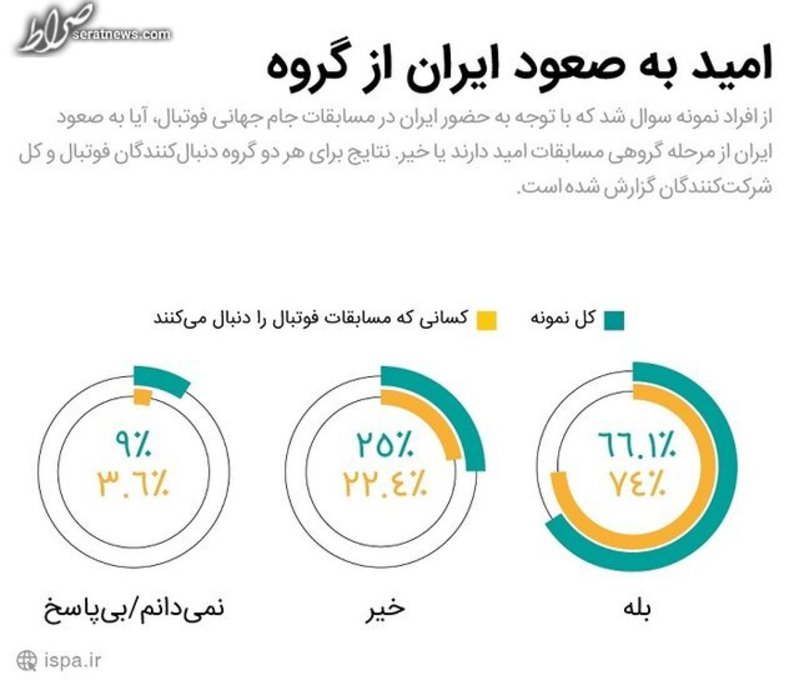 مرکز افکارسنجی دانشجویان ایران (ایسپا) نظرسنجی را در خصوص فوتبال و مسابقات جام جهانی ۲۰۲۲ قطر انجام داد. نتایج این نظرسنجی نشان میدهد ۶۶.۱ درصد از کل پاسخگویان امیدوارند ایران از گروه خود به مرحله بعدی صعود کند.