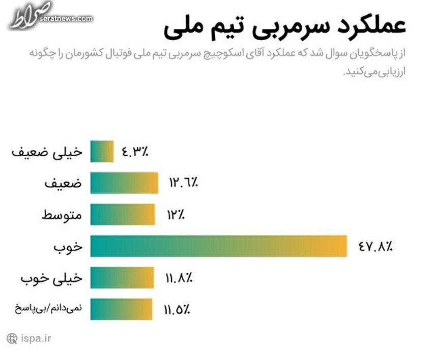 از کسانی که پیگیر مسابقات فوتبال هستند پرسیده شد: عملکرد آقای اسکوچیچ به عنوان سرمربی تیم ملی فوتبال کشورمان را چگونه ارزیابی میکنید؟ ۱۶.۹ درصد عملکرد وی را ضعیف ارزیابی کردند. ۱۲ درصد معتقدند عملکرد وی متوسط بوده و ۵۹.۶ درصد عملکرد سرمربیتیم ملی فوتبال را خوب ارزیابی نمودهاند. ۱۱.۵ درصد هم گزینه نمیدانم را انتخاب کردند یا به این سوال پاسخ ندادند. همچنین ۴۹.۵ درصد از افرادی که پیگیر فوتبال هستند، با تغییر سرمربی تیم ملی فوتبال (آقای اسکوچیچ) مخالف و در مقابل ۳۹.۲ درصد با این تغییر موافق هستند. ۱۱.۳ درصد به این سوال پاسخ ندادند.