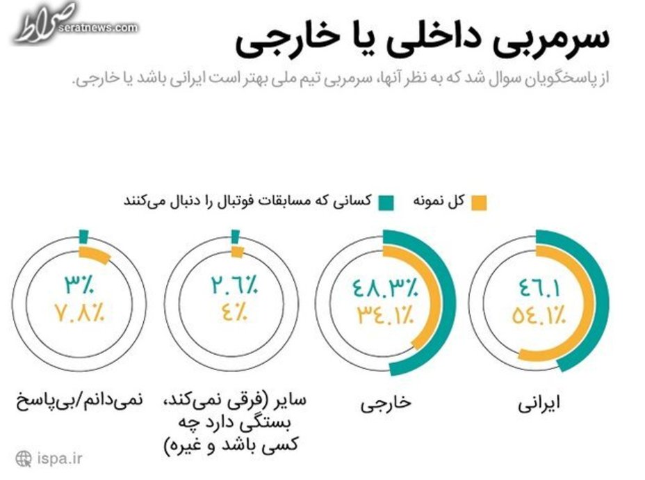 در بخش دیگری از این نظرسنجی درخصوص سرمربی خارجی یا ایرانی از پاسخگویان سوال شد. ۵۴.۱ درصد از کل پاسخگویان معتقدند بهتر است سرمربی تیم ملی فوتبال، ایرانی باشد. این عدد برای افراد نمونه که پیگیر مسابقات فوتبال هستند ۴۶.۱ درصد است. در مقابل ۳۴.۱ درصد از کل پاسخگویان بیان داشتند بهتر است سرمربی تیم ملی فوتبال خارجی باشد. این عدد در بین کسانی که مسابقات فوتبال را دنبال میکنند، ۴۸.۳ درصد است.