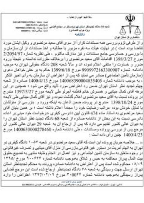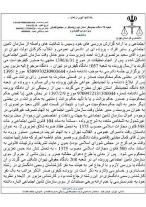 سعید مرتضوی به عنوان سرپرست و مدیر عامل وقت سازمان تأمین اجتماعی در این پرونده به تصرف غیرقانونی در وجوه و اموال سازمان تأمین اجتماعی به منظور پرداخت و اختصاص این وجوه از محل بودجه غیرشمول به اشخاص متعدد، محکوم به تحمل ۷۰ ضربه شلاق شده بود.