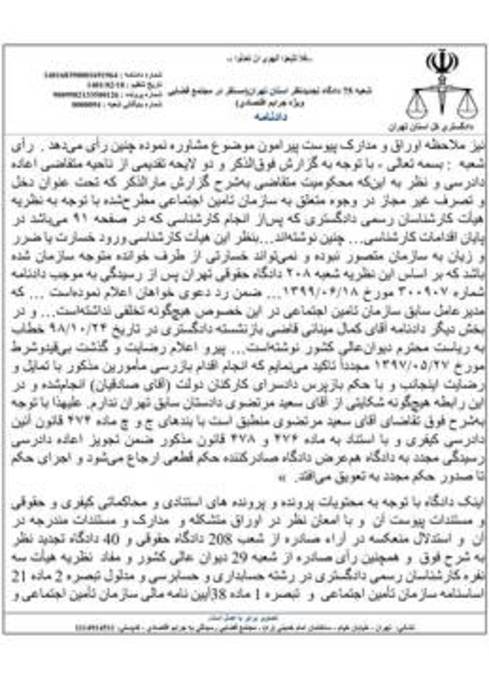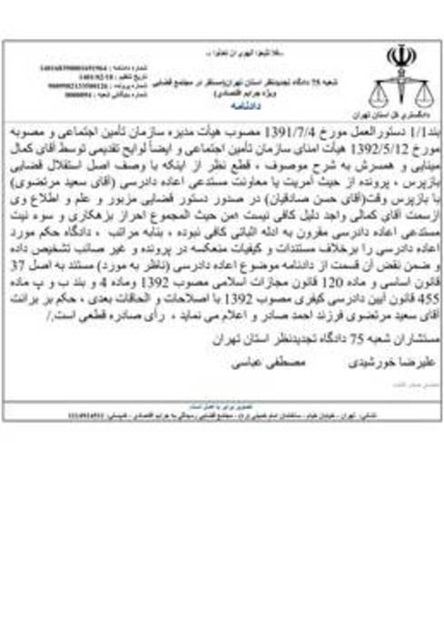 به گزارش پایگاه خبری صراط به نقل از اعتماد آنلاین، شعبه ۲۹ دیوان عالی کشور برای سعید مرتضوی در پرونده تامین اجتماعی حکم برائت صادر کرد. مرتضوی از طریق درخواست اعمال ماده ۴۷۴ قانون آییننامه دادرسی کیفری، حکم برائت خود را دریافت کرده است.