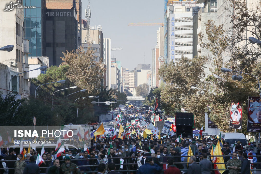این مراسم که هرساله در مقابل لانه جاسوسی و خیابان طالقانی برگزار میشود؛ امروز به دلیل حضور جمعیت انبوه حاضرین در مراسم تا خیابان ولیعصر ادامه داشت.