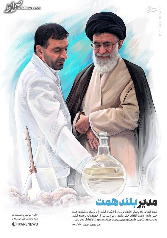 «شهید طهرانی مقدم سراپا اخلاص بود من ۶-۲۵ ساله ایشان را از نزدیک میشناسم. همت خیلی بلندی داشت افقهای خیلی بلندی را میدید. یکی از خصوصیات برجسته ایشان مدیریت بود. یک مدیر طبیعی بود درس مدیریت هم نخوانده بود اما واقعاً یک مدیر بود.»
