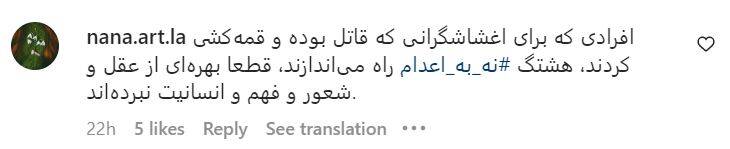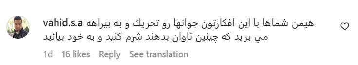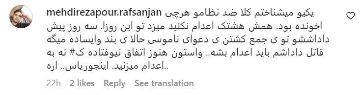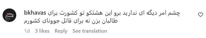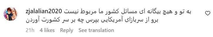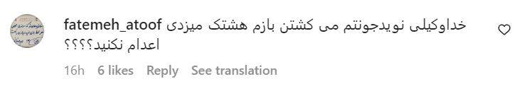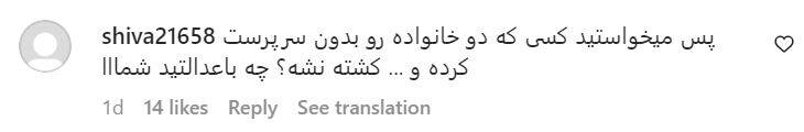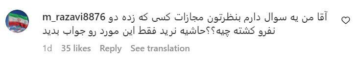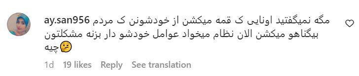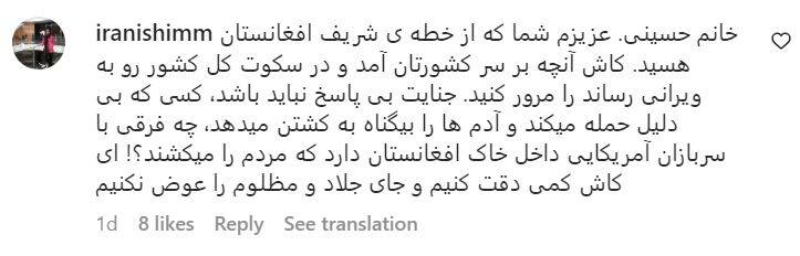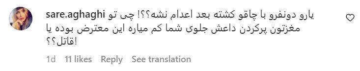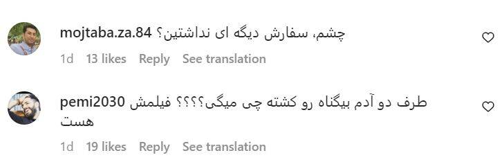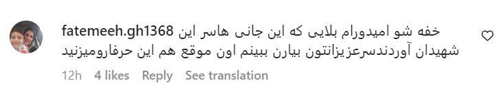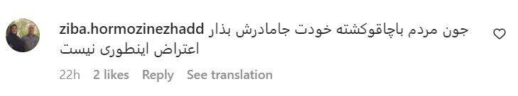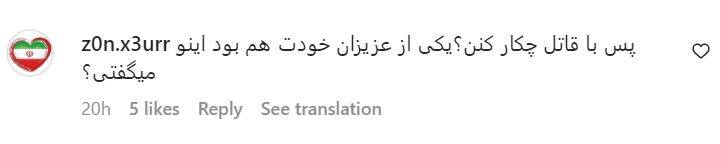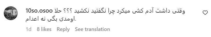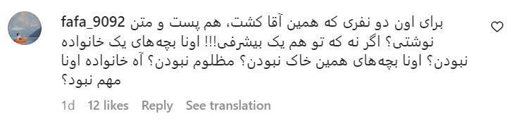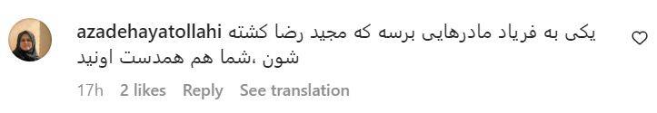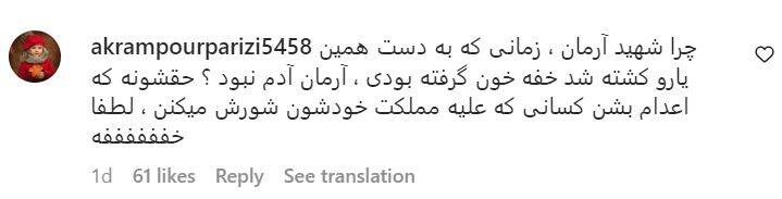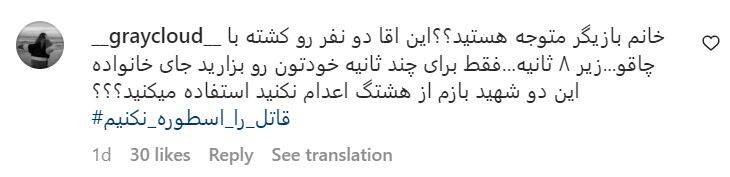 اما کاربران فضای مجازی در بخش کامنت های این بازیگر، واکنش مثبتی از خود نشان نداده و از هشتگ «قاتل را اسطوره نکنید» استفاده کردند. این کاربران همچنین به شهروندانی که به دست مجید رضا به شهادت رسیدند اشاره کرده و خواستار علت عدم واکنش این چهره ها نسبت به شهادت افراد بی گناه و حال و هوای مادرانشان شدند.