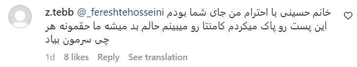 به گزارش پایگاه خبری صراط به نقل از مشرق، فرشته حسینی، بازیگر سینما و همسر نوید محمدزاده، در واکنش به اعدام آشوبگران اعتراضات اخیر، هشتگ «اعدام نکنید» را در پست اینستاگرامی خود منتشر کرد. این اقدام در پی واکنش برخی چهره های هنری و ورزشی نسبت به اتفاقات اخیر بوده است. برخی از همکاران فرشته حسینی نیز در این ایام همانند او نسبت به اعدام ها واکنش نشان داده و خواستار لغو و یا حتی ازادی عوامل آشوب در کشور شدند. به نظر میرسد این پست در واکنش به اعدام مجید رضا رهنورد منتشر شده باشد.