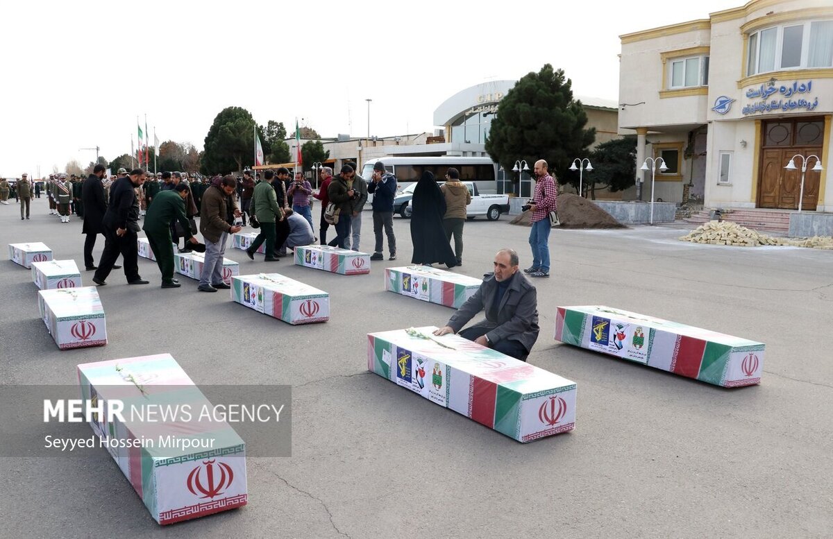 پیکرهای مطهر ۱۲ شهید گمنام دفاع مقدس وارد فرودگاه بین المللی شهید هاشمی نژاد مشهد شد.