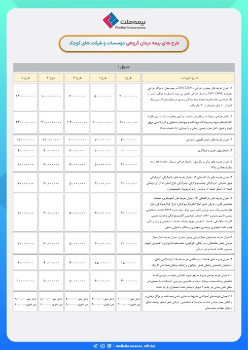 در طرح بیمه تکمیلی درمان کسبوکارهای کوچک، تمامی شرکتها و کسبوکارهای کوچک و متوسط میتوانند از پوششهای بیمه تکمیلی بیمه ملت بهرهمند شوند و از خدمات درمانی استفاده کنند.