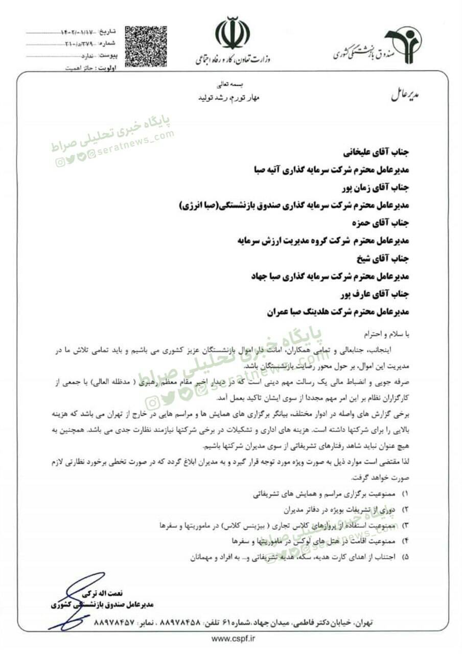 به گزارش پایگاه خبری صراط، نعمت اله ترکی مدیرعامل صندوق بازنشستگی کشوری در نامهای خطاب به مدیران عامل شرکتهای زیرمجموعه، از آنها خواسته تا ضمن امانتداری نسبت به اموال بازنشستگان عزیز کشوری، از بریز و بپاشهای غیرضرور و رفتارهای تشریفاتی جدّاً خودداری کنند.