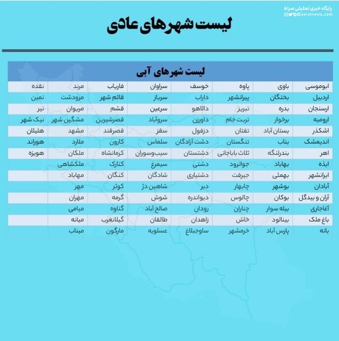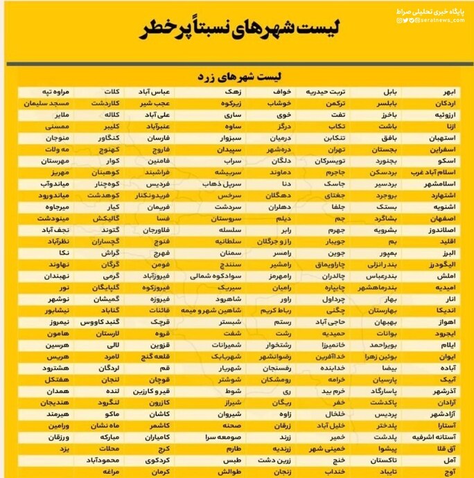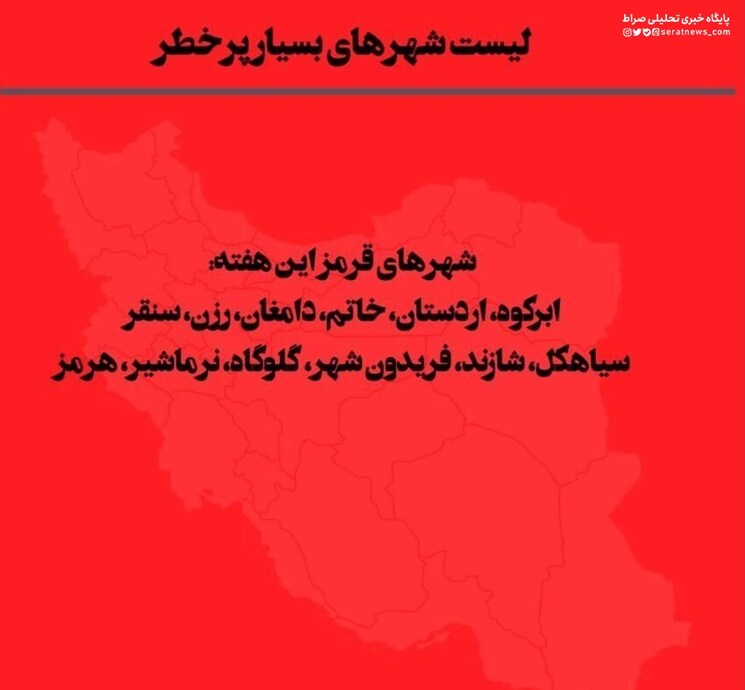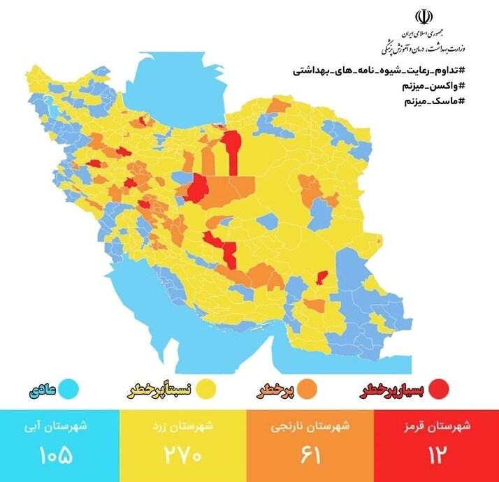به گزارش پایگاه خبری صراط، مرکز روابط عمومی و اطلاعرسانی وزارت بهداشت اعلام کرد که تعداد شهرهای با وضعیت قرمز از ۱۸ به ۱۲ شهر و تعداد شهرهای با وضعیت نارنجی از ۷۶ به ۶۱ شهر کاهش یافت. همچنین تعداد شهرهای با وضعیت زرد از ۲۲۷ به ۲۷۰ و تعداد شهرهای با وضعیت آبی از ۱۲۷ به ۱۰۵ شهر رسید.